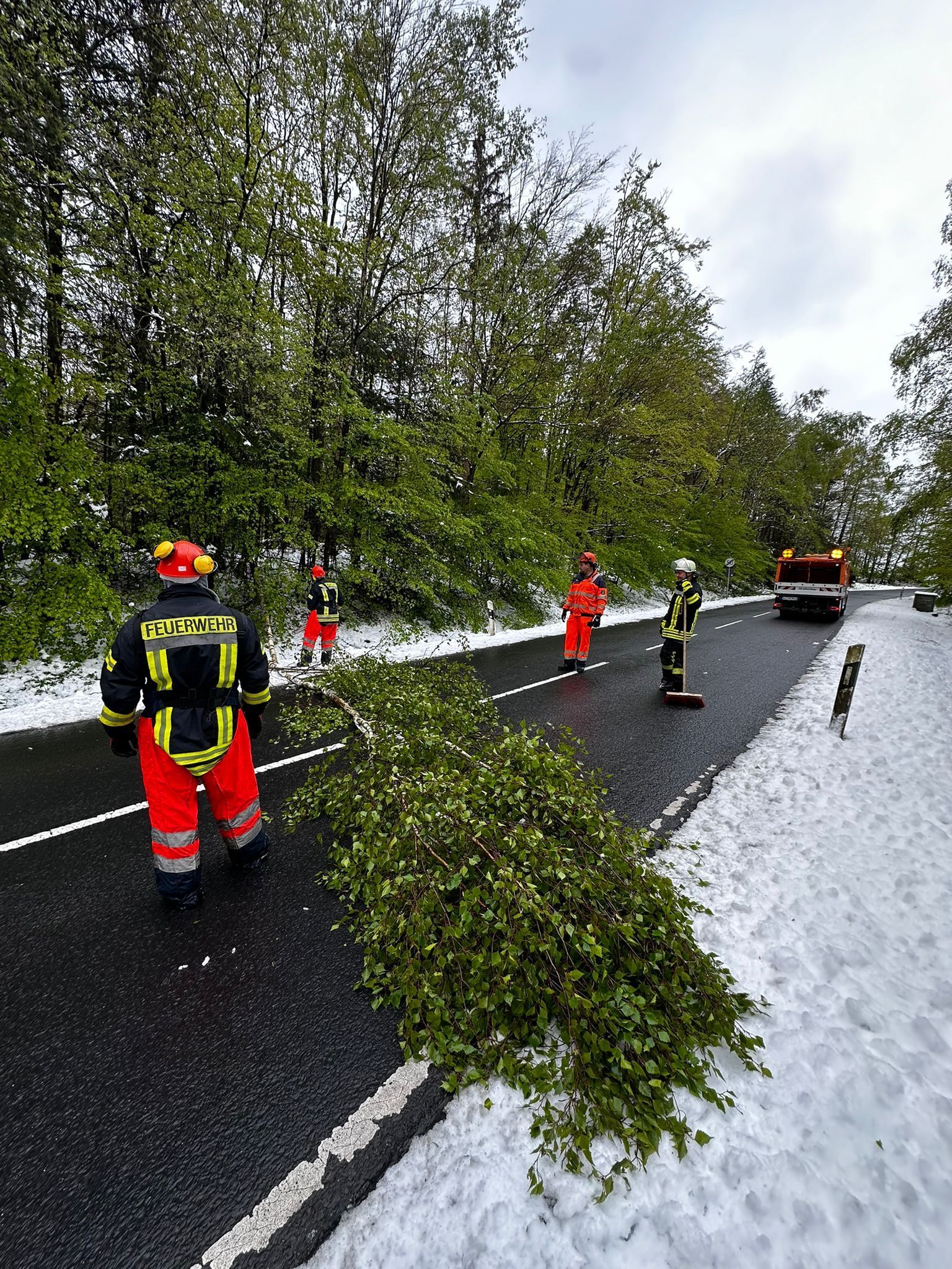 Nach starken Schneefällen in der Nacht knickten durch die hohe Schneelast mehrere Bäume und Äste um und blockierten mehrere Straßen im Gemeindegebiet. Auch Objekte oder Freileitungen waren durch umgefallene Bäume beschädigt.