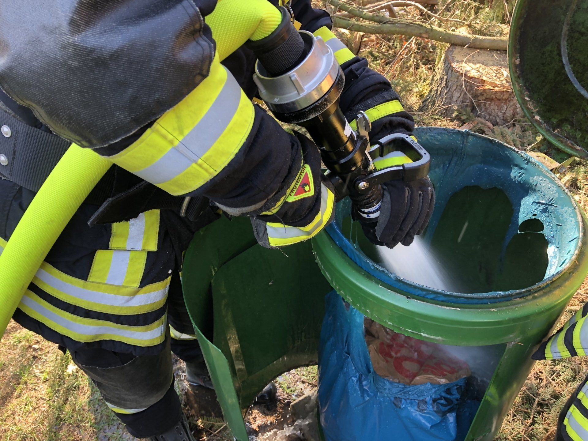 Mit dem Einsatzstichwort "F1 - Brennt Müllcontainer" wurden die Einsatzkräfte an den Waldparkplatz Nässegrund alarmiert. Beim Eintreffen quoll weißer Rauch aus einem Mülleimer.