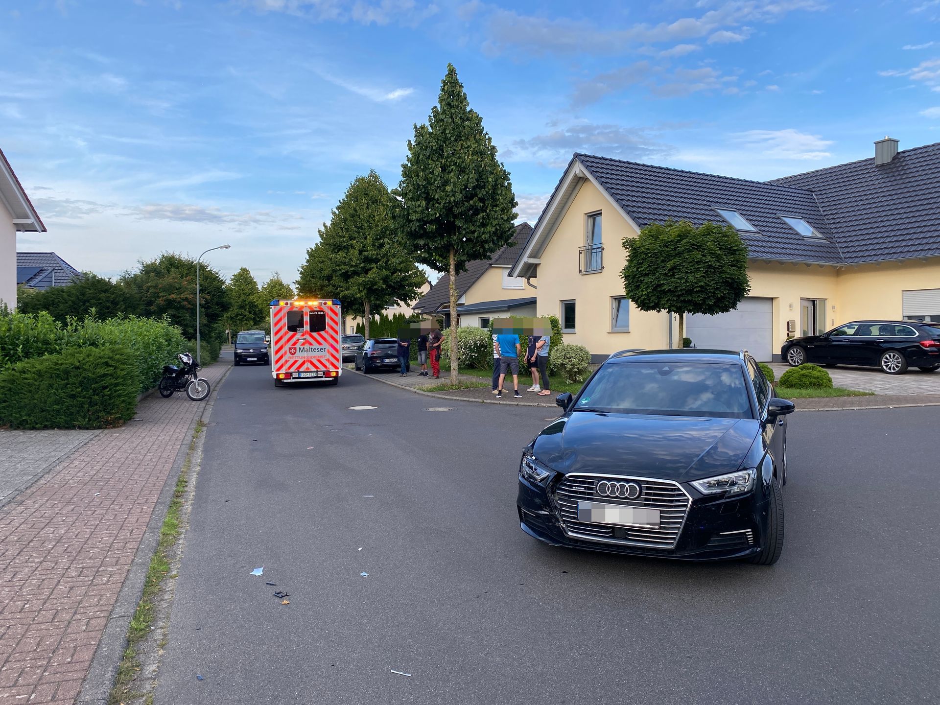 Ein Mofafahrer übersah im Kreuzungsbereich einen vorfahrtsberechtigten PKW und krachte in dessen Front. Dabei zog der Mofafahrer sich Verletzungen zu. Der PKW Fahrer blieb unverletzt. Am Fahrzeug entstand ein Sachschaden. Es liefen keine Betriebsstoffe aus.